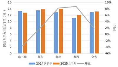 1.本统计期内,全省网约出租车日均订单量约13.23单,较2024年下半年增长1.81%,其中珠三角地区日均订单量约12.85单,较2024年下半年下降3.70%;粤东地区日均订单量约13.88单,较2024年下半年增长2.02%;粤西地区日均订单量约12.15单,较2024年下半年增长8.74%;粤北地区日均订单量约14.04单,较2024年下半年增长8.25%。
