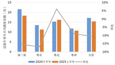 1.本统计期内,全省巡游出租车单车日均载客约15.45次,较2024年下半年下降10.50%,其中,珠三角地区日均载客约18.36次,较2024年下半年下降15.47%;粤东地区日均载客约11.33次,较2024年下半年下降16.99%;粤西地区日均载客约10.83次,较2024年下半年下降8.99%;粤北地区日均载客约16.29次,较2024年下半年增长6.05%。