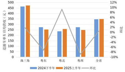 3.本统计期内,全省巡游出租车单车日均营收约348.22元,较2024年下半年增长0.43%,其中,珠三角地区单车日均营收约472.97元,较2024年下半年增长1.78%;粤东地区单车日均营收约254.20元,较2024年下半年下降7.24%;粤西地区单车日均营收约248.96元,较2024年下半年下降8.89%;粤北地区单车日均营收约258.46元,较2024年下半年增长9.24%。