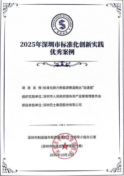 在深圳市国资委的统筹引领下,深圳巴士集团承担的纯电动公交运营服务标准化试点项目建设经验成功入选产业科技创新实践案例,是深圳市三家市属国企获选案例之一,充分体现了市属国企在标准化建设中的示范引领作用。