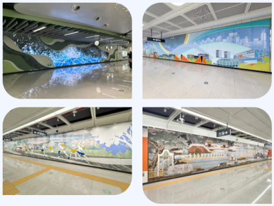 车站文化墙融合了地域特色,展现曲海龙舟、大朗毛织、荔香荔园、松山湖科学城等东莞标志性元素,以艺术笔触,生动呈现各镇街的历史底蕴与现代活力,让乘客在出行中感受湾区文化韵味。