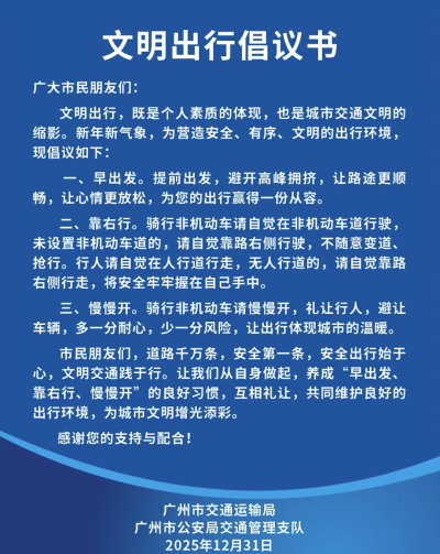 文明出行,既是个人素质的体现,也是城市交通文明的缩影。新年新气象,为营造安全、有序、文明的出行环境,广州市交通运输局、广州市公安局交通管理支队近日联合向广大市民发布文明出行倡议书。