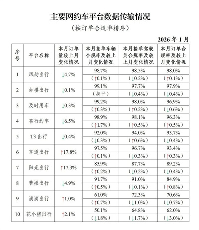 一、在订单量前10名的平台中,按订单合规率(指驾驶员和车辆均获得许可的订单量占比)从高到低分别是风韵出行、如祺出行、及时用车、喜行约车、T3出行、享道出行、阳光出行、曹操出行、滴滴出行、花小猪出行。本月订单合规率增长前3名的依次是曹操出行、喜行约车、享道出行;增长最后3名的依次是及时用车(-0.6%)、滴滴出行(-0.7%)、花小猪出行(-3.0%)。