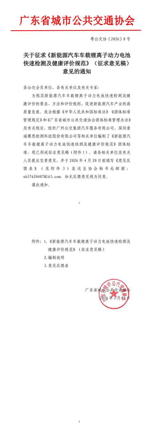 关于征求《新能源汽车车载锂离子动力电池快速检测及健康评价规范》(征求意见稿)意见的通知