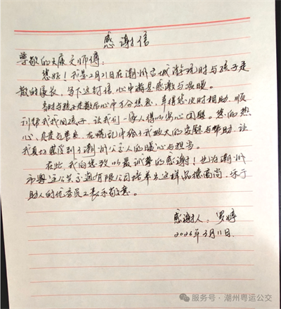 游客回到家后,内心久久不能平静,特意将一封手写的感谢信和一面锦旗寄到潮州粤运公交公司。信中写道:“您的热心、负责与善良,在慌乱中给了我极大的安慰与帮助,让我真切感受到了潮州公交人的暖心与担当。”寥寥数语,承载着浓浓的感激之情。