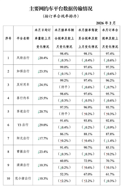 其中,面向乘客、与网约车平台公司共同提供服务的平台(俗称网约车聚合平台)完成2.24亿单,日均订单量环比下降18.0%(主要受春节假期影响)。按订单合规率从高到低分别是花小猪出行、滴滴出行、高德打车、百度打车、携程用车、腾讯出行、美团打车。