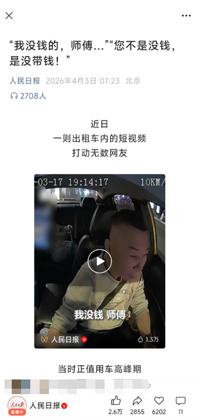 2026年3月17日晚高峰,如约出行“的哥”吕伟斌看到路边一位老人招手,稳稳靠了过去。但这位八旬老兵忘了带钱,面露窘色。吕伟斌笑着安慰老人:“没事,不收钱!”“您不是没钱,您是忘了带钱。”“最重要的是您要保重身体,保重腿脚!”得知老人上过战场,他动情地说:“您是上过战场的,保卫过我们的!我们就应有感恩的心,我是不会收您钱的!”